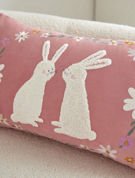 Double Rabbit Floral Embroidered Cushion Pink 30x50cm