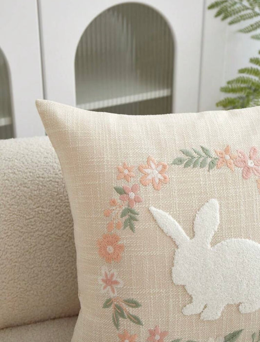 Rabbit Floral Wreath Embroidery Cushion Natural